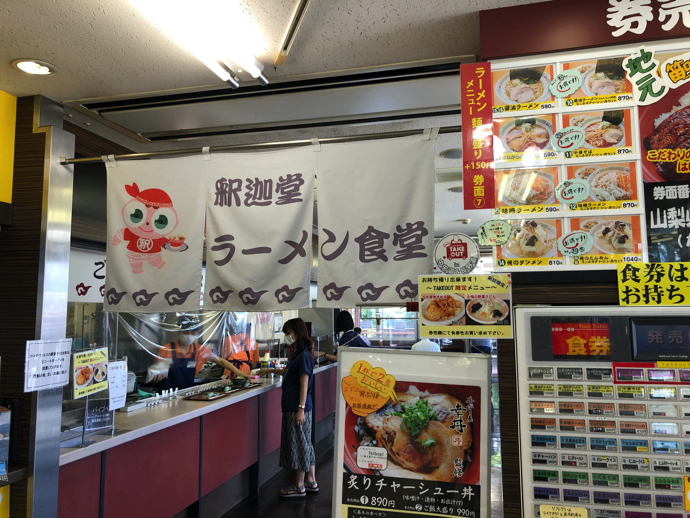 そんな高速道路の使い方をしているのだが、このコロナの時期に、SAPAは一体どういう対応をしているのか興味があり、中央道のPAに立ち寄ってみた。そうしたら、なんとセルフサービスの食堂が、大変身していた。その名も「釈迦堂ラーメン食堂」というブランド化された変身だった。なんだかすごいな。暖簾一つかかるだけで、雰囲気が随分と変わるものだ。個人的には、白地に赤の文字で「らーめん食堂」と書いて欲しかったが・・・。それとキャラはやはりチャイニーズ・ドラゴンの龍が良かったと思う。