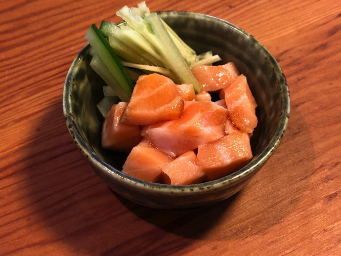 刺身用サーモンを買ってきて、札幌の鮨屋で食べたサーモンユッケを再現しようと試みたら、何となく簡単にできてしまった。人によっては好き嫌いのある、九州の甘い醤油を流用しようと思っていたのだが、ふと気がつき、自作の蕎麦つゆ用の「かえし」を使ってみた。おまけでちょっとだけ日本酒を足してみたのが正解だったようで、大振りに切ったサーモンに山葵を乗せてぐちゃぐちゃに混ぜてみれば、あっという間に出来上がり。これは、早い、簡単、うまいの三拍子が揃ったスーパーな酒の肴になった。自分で作って思ったが、きゅうりの細切りがポイント高い。歯触り、食感のカリカリというのはサーモンのねっとりした食感と合わせて楽しむのに良い。