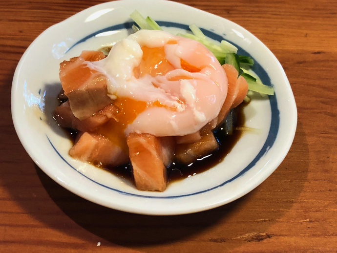 サーモンの切り身が余ったので、今度は九州醤油で温玉乗せにしてみた。きゅうりの追加も忘れずに。ただし、温玉乗せなので、これはぐちゃぐちゃに混ぜるのはやめて、卵の黄身と混ぜながら食べることにした。個人的にはこの温玉乗せの方が多少料理した感が出るので、皿を変えて薬味別添で、みたいなチョコザイな技を使うとグレードアップしそうだなどと思ったが。