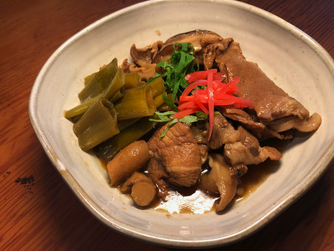 野菜を焼きながらチャチャっと作ってみたのが、豚肉のポン酢煮で、テレビのCMでやっていたやつをパクってみた。臭い消しに長ネギの先っぽの緑のところを放り込んだくらいで、基本は和風だしでサッと煮た豚にポン酢と砂糖と椎茸を投入しただけ。仕上げに紅生姜と大葉を乗せてみたのは「味変」狙い。