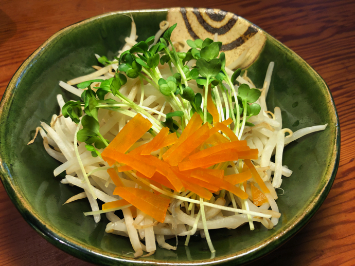 大量のモヤシをさっと茹で、ラー油とポン酢でたべてみようとおもったが、それでは味に変化が足りないと思い直し、かいわれ大根と、大根の味噌漬けを千切りにしたものを乗せてみた。だいたい味噌漬けというのは塩分高いので、ご飯に乗せて白飯を爆食いする時くらいしか使い道がないのだが、刻んで薬味にすると万能調味料に変化するので、冷蔵庫の常備品だ。