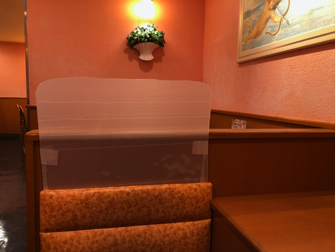 代わりに見つけたのだ、隣り合った席を遮蔽する背もたれの後ろのプラボード。これでは頭の高さギリギリくらいなので、ちょっと効果に微妙さが残る気がするが。