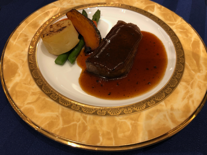 パーティーご飯の話を続けるのは、いささか恐縮するのだが。おいしいものはおいしいという話なので、その続きを。セカンド・アントレというべき、豪速球なフィレのステーキ。このあたりでお腹はそろそろ満タン近い。だから肉のポーションは小さめで、フィレを使っているのはソースに合わせたいからなのだろうなとは理解できる。定食屋ではないのでライスはつかないが、これはちょっと白飯と合わせたい気分になった。肉が柔らかくて、ソースがうまいとご飯が欲しくなる。普通のフレンチコースであれば、テーブルの上にはパンがあるので、それを楽しむ手がある。ところが、今回はフレンチと懐石の融合コースなので、この後に正式なご飯が出る。なので、パンが見当たらない。