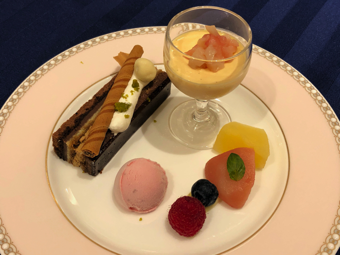そして、この後に鯛飯と赤出汁の味噌汁が出て、お腹はほぼ隙間無しになったのにも関わらず、ドーンとデザートプレートが出てきた。なんだか、これはイタリアン的な出し方だなあなどと持っていたら、本当はワゴンで好きなだけ注文できるという仕組みだったのが、コロナのせいでプレートになったとのことだ。