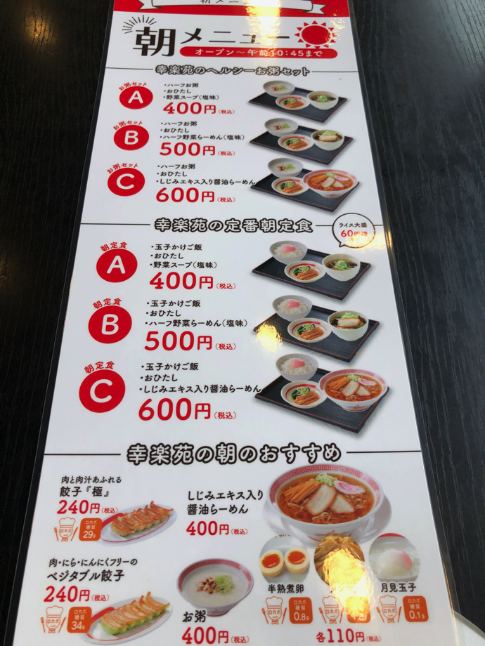幸楽苑というラーメンチェーンが朝食に挑み始めたと聞き(幸楽苑は外食玄人経営者のはずなので、そこはちょっと違っているだろ)、ヨタヨタと自転車を走らせ朝飯を食べに行った。価格は微妙な400・500・600円という三階層で、昨今流行になっている税込価格。ただもう直ぐ価格表記は税込に一本化されるので、それの先取りということもあるのだろう。
