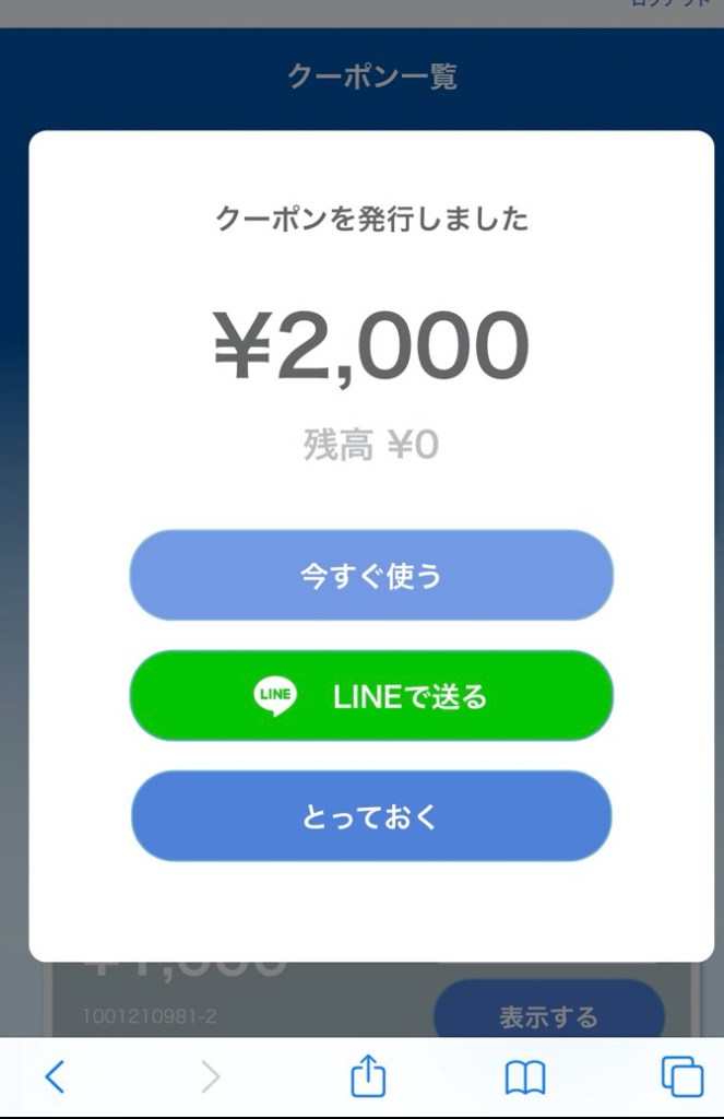 今回使えるクーポン合計額は4000円だった。そこからまず2000円分を引き出す。そうすると下のような画面になるのだが、ここで2000円使うのであれば、「今すぐ使う」で良いのだろう。ただ、4000円全額使いたいとなると、どうすれば良いのか。