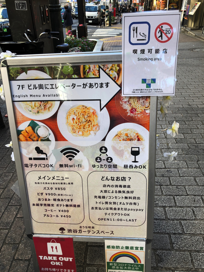 道玄坂で見つけた、東京都内で珍しい喫煙可能店のサインだった。喫茶店というか、カフェというか。本当は実際にお店を使ってみて感想を書けば良いのだろうが、この看板を読み込むと、色々と考えさせられた。おそらくこの店の経営者が開店の時に考えていたコンセプトというか店舗のイメージとは、今や全く違ったものになっているのだろうなということだ。
