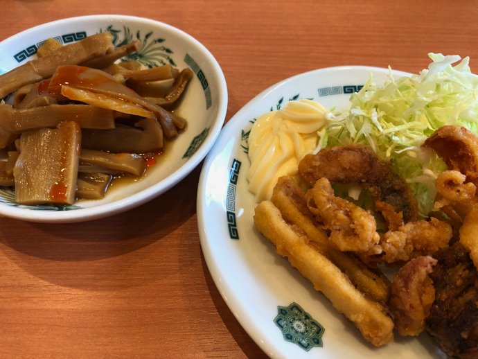 高層マンションの一階という立地なので、黒と白のスタイリッシュデザインで、いつもの中華食堂という感じではない。ただし店内に入れば、何やら居酒屋風の壁のメニューが目立ち、中華食堂というより焼き鳥屋とか、オヤジ向け居酒屋の気配がぷんぷんするのがちょっと可笑しい。日高屋ファンには安心できる雰囲気を作ろうという意図はわかる。
