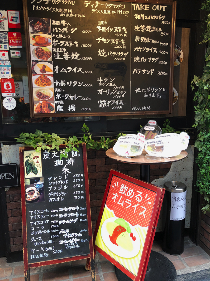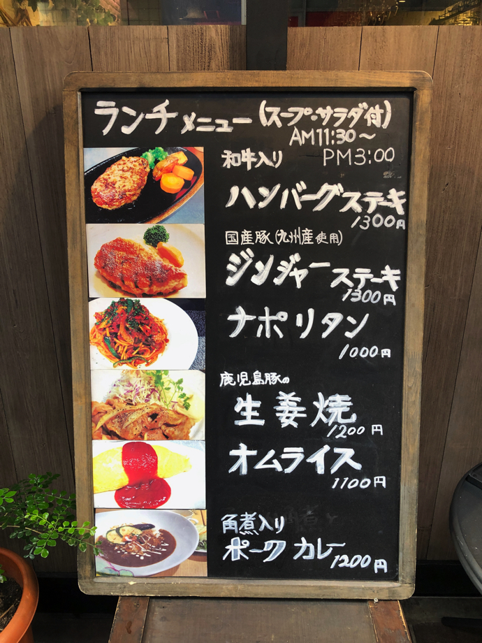 店頭のブラックボードを見れば洋食屋のような気がする。お値段は渋谷駅近という立地を考えればリーズナブルというべきだろう。ナポリタン1000円が今の東京の昼飯の相場か。ポークステーキ(1300円)はちょっと珍しい。生姜焼き(1200円)は絶対定番ながらちょっとお高いかもな、などと眺めていたのだが・・・。