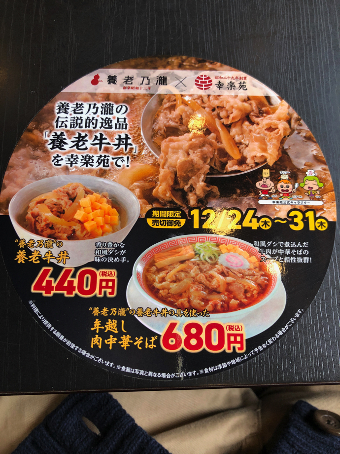 これでも一応は幸楽苑の少数株主で、株主優待券をもらっている。日頃からよくこのお店には通っているからあれこれ気がつくことがある。その少数株主として、最近の幸楽苑の狼狽えぶり?にはいささか心配していた。どんどんメニューラインを変えているようで、やっていることは単純値上げに近いではないか。値上げに伴って商品を磨いていかないとダメなんだぞ、などといいたいことはたくさんあったが。どうやらノスタルジー路線に復帰したのか、妙なことをやっているなあと、アタ、アタモゾ気に入ってみた。いわゆるコラボ企画だが、そもそも今現在養老乃瀧はどれくらい店舗数があるのだろうか。そして、養老乃瀧で牛丼が売っていたこと知っている人間って、いったい何歳なのと思う。少なくとも、現役サラリーマン世代ではほとんど知らないと思うが・・・。