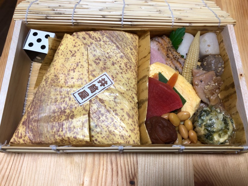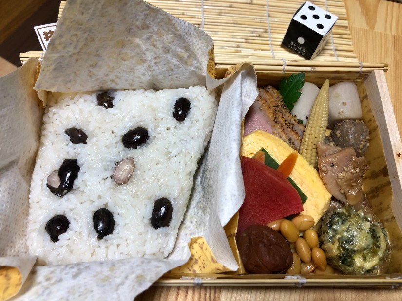 中を開けると竹皮もどきの紙に包まれたご飯とおかずが登場する。サイコロの中はデザート用の飴玉だった。サイコロに合わせてご飯の包みは長方形ではなく台形というのが、これまた芸の細かさだ。おかずは幕の内弁当的定番風なのだが、これがまた実に繊細なものだった。弁当についてくる卵焼きといえば甘いだけの薄っぺらいイメージがあったが、この卵焼きは「だし巻き」で、それも出汁の味がとても強い。首長たっぷりの卵焼きだった。鳥肉の煮物が入っているが、浴びせかけるように「薄切りかも肉」が存在感を示している。そしてなにより感心したのが、大豆の煮物。これも普通の弁当であればちょっと甘すぎな感じの煮豆でお茶を濁すところだろうが、これはなんと小エビと一緒に炊き込んだらしい。エビの味が染み込んでいる。豆の中に小さな赤い物体を見つけてわかったことだ。エビの佃煮みたくなっているが、これは豆と一緒に仕上げたものだろう。実に芸が細かい。
