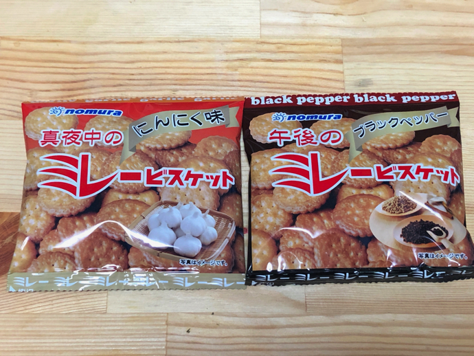 そして、みんな大好きビスケットだ。なぜ高知県でこのミレーのビスケットが有名なのかは、さっぱりわかっていないが、高知に行くたびに買い込んでいた。ちょっとみない間に、何やら怪しげなフレーバーが増えていて、真夜中のニンニク味と、午後のブラックペッパー味の2種を調達。個人的好みで言えば、甘いビスケットとニンニク味のアンバランスが好みだった。子供ウケしそうな味ではないが、濃いめのウイスキー水割りにはぴったりの様な気がする。