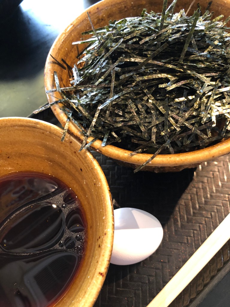 手前のそばつゆは甘辛濃いめで、つゆの上に浮かんでいるのがラー油で、生卵はサービス。最初から卵を入れる人もいるが、個人的な好みでは最初はつゆだけで濃いめの味を楽しみ、その後テーブル常備品の生卵、揚げ玉などで味変をする。そばは太めでもちもちツルツル系の、通常の日本蕎麦とはだいぶ違うものだ。あえて言えば、新潟のへぎそばに近いし、山形の鳥そばの麺もこんな感じだから、原点は新潟か山形あたりなのかもしれない。スーパーで売っているようなものではない。