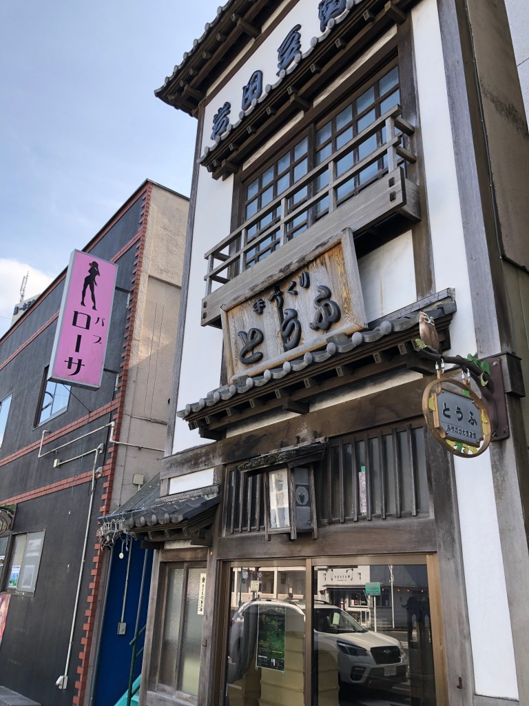 秩父駅の駅前は、おそらく商店会の定めなのか。お店の先に丸い看板がかかっている。この風格のある豆腐屋には「とうふ」とかかっている。なんともアートな看板で綺麗なものだと思ってみていたのだが、豆腐屋の横のピンクの看板「ローザ」さんが気になった。このお店の看板はどうなっているのかと探してみたら、「しょくどう」とひらがなで書いてあった。なんとなく、なるほどねえ、と納得した。この丸い看板の制作者かデザイナーか、天才的なセンスを持っているのだ。一度仕事をご一緒したいくらいの感動だった。