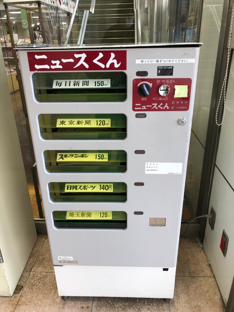 秩父駅には売店らしきものがなく、横に土産物屋が併設されているためなのかもしれないが、ちょっと面白いものを発見した。ニュース君、これはすごい。この新聞のラインアップが系列無視というかなんと言えない。3日とスポニチは系列のはずだが。東京新聞の系列スポーツ紙(東京中日スポーツ)は無視して、朝日新聞系の日刊スポーツが入っている。埼玉県では読売新聞のシェアが高いが読売は本誌もスポーツ紙もなし。そして、埼玉新聞という希少新聞がセットされている。なんとも、素晴らしい新聞社選択。いったいどこがこの機械を設置しているのだろう。毎日新聞か?秩父鉄道か?