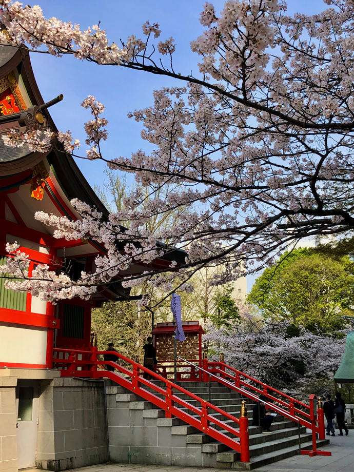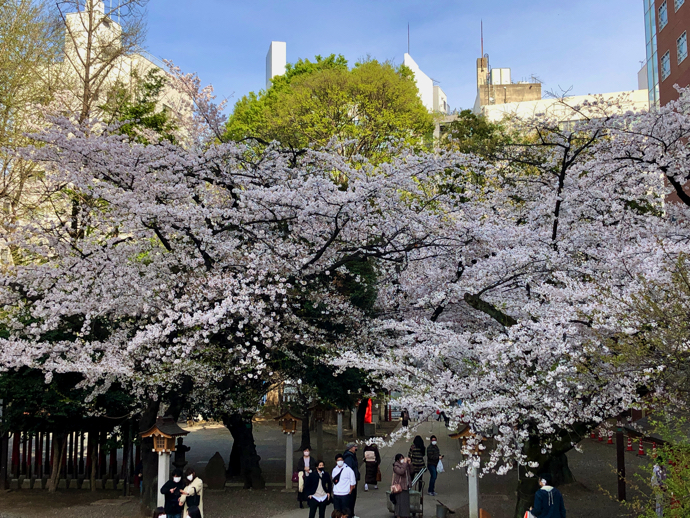 新宿の宮街のわい雑な感じとは打って変わる神社の中の気配だが、週末というのに意外と人出は少ない。桜はほぼ満開で、ビル街の中ではちょっとした穴場感がある。