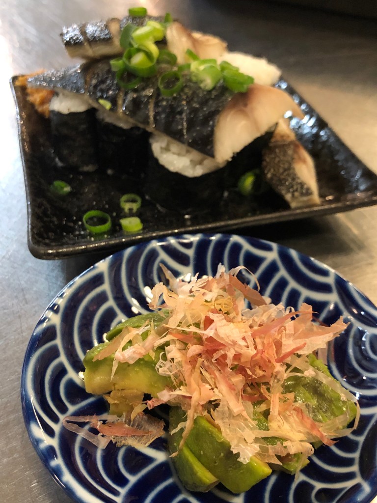 時計台の近くのビル地下にある「立ち飲み屋」と言いながら座って飲める店があり、そこの売り物は日本酒の豊富なラインアップなのだが、実は肴がうまい。手前がアボカドのニンニク味噌漬け、奥が炙りシメサバの鮨。この寿司がちょっと変わっていて、中に何も入っていない巻き鮨の上に、魚が乗っているという「微妙なスシ感」がある食べ物なのだ。これが、けっこう気に入っている。この店以外では食べられないだろう。