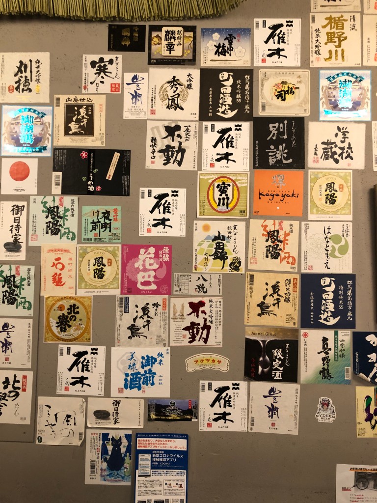 剥き出しのコンクリートの壁に日本酒のラベルが大量に貼られていて、あれは飲んだことがある、これは名前も知らなかった、などと呑んべいの心をゆさぶる、怪しいアートになっている。