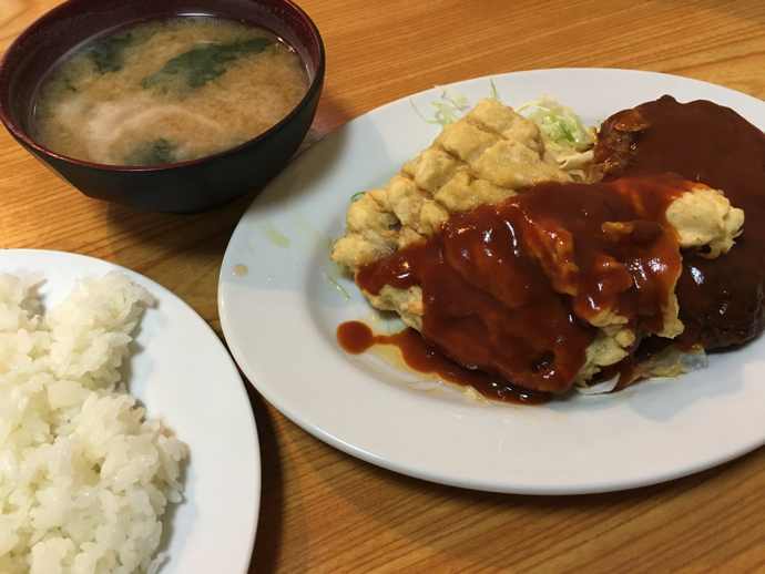 大分名物の「鳥天」があるのだから、豚肉を天ぷらにして何が悪い、と料理長が思っているかどうかは定かではないが、ありそうでなかったメニューだろう。この「豚天」をどう食べるかもちょっとした悩みの種で、いろいろと考え込んでしまう。そのまま何もつけずに食べる、ハンバーグのソースをちょい付けする、ウスターソースを要求して大阪風に食べる、醤油をもらい天汁がわりにするなどなど。ご飯に味噌汁に豚天で立派な豚天定食になりそうだが、豚天はあくまでハンバーグ定食の付け合わせなので・・。ちなみに、このお店で豚天単品はメニューに載っていません。ランチ限定「幻」級の一品なのです。