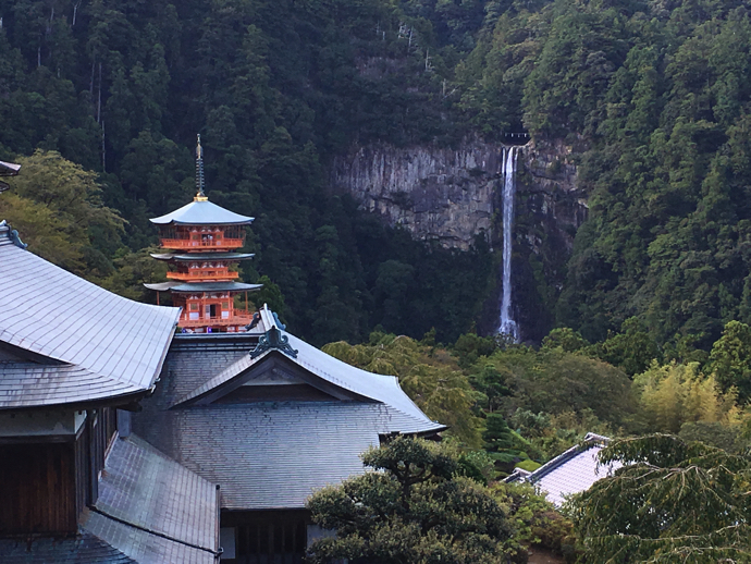 那智大社から那智の大滝を望むと、青岸渡寺が目に入る。確かにこのアングルで大滝を見るために作った神社仏閣なのだろうなと納得する位置関係だった。車でくればすぐ近くに止めることもできるが、歩いて登る時代は、実に大変だったろうな。このありがたみの差が、ちょっと気になるが、歩いて登るかと問われれば、首を横に振るしかない。修験道の行者の場所だ。