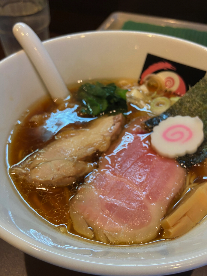 恵比寿神社のそばにある渋い外観の店がラーメン屋で、恵比寿でもいぶし銀のラーメン店といえる。コロナ前は昼時には長い行列ができていた。カウンターだけの店なので、並ぶのも仕方がないとは思うが会社のランチタイムでは並んで待ち余裕がなく、いつも横目で睨んでいただけだった。この時期だとひょっとして・・と期待しながら店先を覗いてみたら行列ゼロ。お店の方には申し訳ないが、ラッキーと店に入った。券売機で「普通の中華そば」を購入し、席について静かに待つ。店内には数名の客がいるが、このご時世なのかひとり食ばかりで会話はない。ラーメン屋が静かなのはとても嬉しい。西新宿の某有名店では、観光客だらけでおまけにキャピキャピな会話、それもうんちく混じりが多くて閉口ものだったが、ここは静かだ。ありがたい。