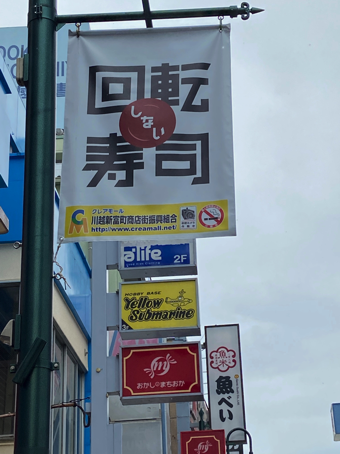 所用で川越の町に来た。川越は江戸時代から続く武蔵国の要衝なので、古い街並みが観光名所となっている。ただ、街の中心部は東武東上線とJR川越線が接続する「川越」駅と西武新宿線「本川越」駅を結ぶ商店街が閉めている。ローカル百貨店も構えている、地方中核都市の賑わいだ。個人的な経験で言えば、東北や北陸中国の県庁所在地以上の賑わいはある。平日昼でもかなりの人出がある。その商店街もこのコロナの影響で店が閉まったり開いたりしているから、通りの左右をキョロキョロみながら歩くのはなかなか楽しい。そしてふと気がついたのが、街灯の下に垂れ下がる広告幕だった。「回転、しない、寿司」。気分は、あれれ・・・となった。
