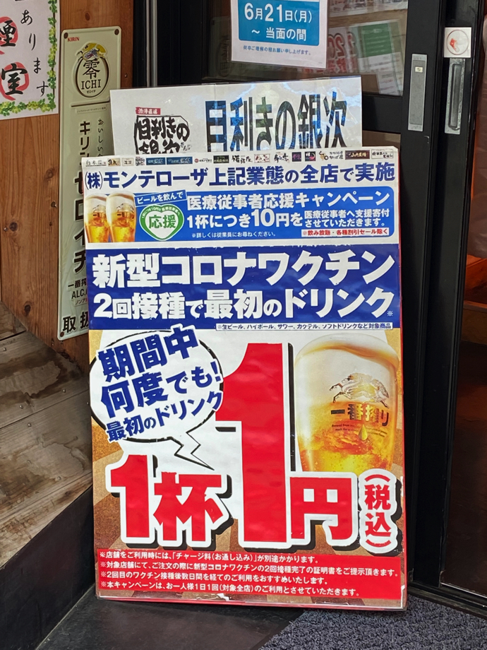 苦戦している居酒屋も、アイデア出しだけは頑張っているなという、実に感心しながら笑ってしまったポスターだった。ようやく職場の集団接種が始まったくらいなので、居酒屋利用の中心世代は、まだまだワクチン接種が始まっていない。にも関わらず、2回接種完了で一円(おまけに税込)でドリンク提供というのは、該当者がほぼゼロという、何やら詐欺っぽい、ジョークっぽい話だ。