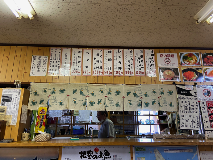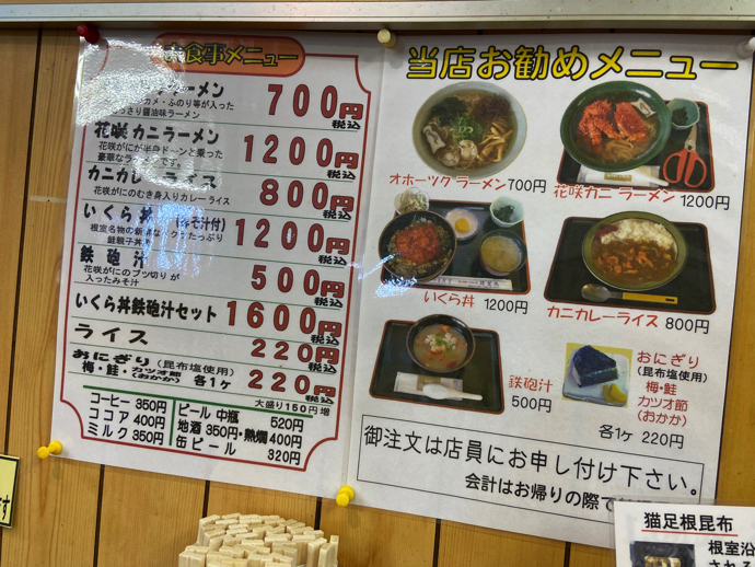 壁に貼ってあるメニューがシンプルでわかりやすい。ラーメン、カレー、いくら丼。ここでちょっとグラっときたのが鉄砲汁で、花咲蟹の味噌汁だ。これは経験的に、とてもうまいものだとしっているが・・・。しかし初志貫徹する。迷ってはいけない。