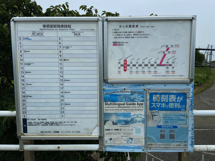この駅にはホームしかない。駅舎は今は存在していない。駅の横は、集合住宅が何軒があるので、やはり根室市の住宅地にあたるのだろう。駅には車で行ったが、確かにまわりには一戸建ての家が多い。ただ、時刻表を見れば明らかだが、通勤通学に使えるほどの列車密度はない。