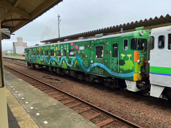 釧路駅のホームに立つと、ラッピング列車が止まっていた。ただ、ちょっと悲しいのが二両編成のうち、一両だけなのだ。なんだか、JR北海道の苦境がそのまま現れているようで物悲しい。確かに、北海移動何のローカル線で一両編成の列車を1日に何本か走らせるために鉄路の維持管理を行うのは経営的に大変なことだろう。バスへの運行切り替えにすれば、鉄路維持費は無くなり、道路の維持費は国と自治体持ちだ。経済的な意味をわきまえない、鉄道ノスタルジーでは語れないリアルな経営の話なのだ。昔のように貨客車を走らせて運行効率を上げるとか、駅に宅配便の営業所を直結するとか、何か新しいビジネスモデルがいるはずなのだが。民営化されているのだからコラボ企画で黒猫ラッピング車とか、飛脚のマークの車とか開発しても良さそうなのになあ。
