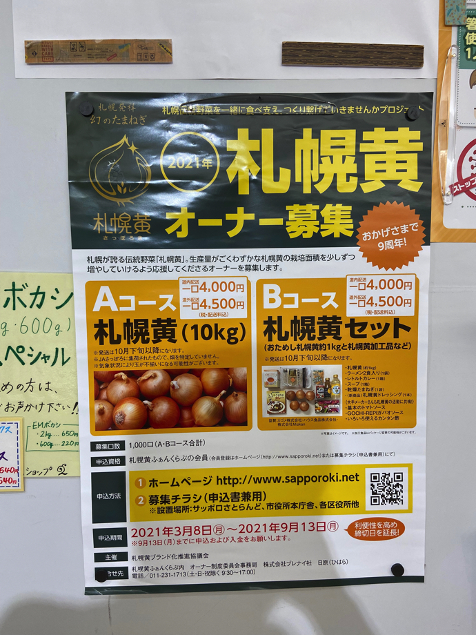 市役所で一息入れたら、そこから地下街に潜り込み、軽く散歩をする。東西に伸びるオーロラタウンと、南北に伸びるポールタウンのつながるあたりに、障害者の作った様々な雑貨や食品を売っている店がある。そこをのぞくのも楽しみにしている。ここではブックカバーとか便箋などをよく購入する。あとは焼き立てパンも好みなのでたまに買い込む。今回は、店の中で「札幌黄」という札幌特産のタマネギの販売ポスターを見つけた。札幌黄は甘みが強く、一時期は北海道タマネギの代表的存在だったが、新品種に置き換わりほぼ絶滅していた。それを最近復活させた農家の方達がいる。これも新しい農業の試みだと思うが、一口応援してみようか・・・。札幌鬼はカレーによく合うのだ。