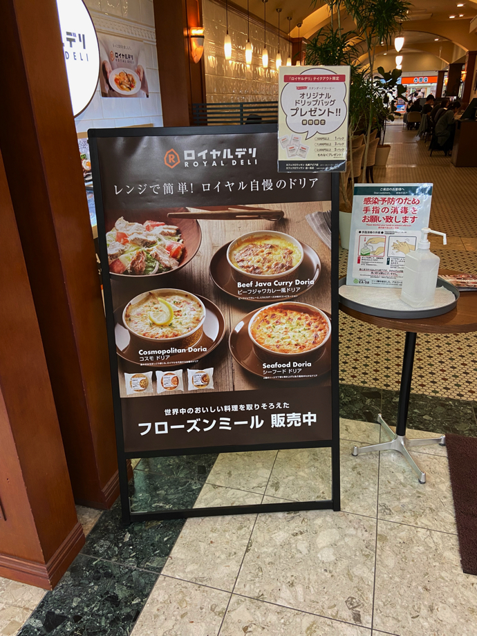 このカフェはロイヤルの系列店だったのかという発見と、カフェで個食の冷凍食品販売は相性が良いなあという感心だった。手指の消毒をする時に必ず目に入る場所に、商品ポスターがあるというのも商売が上手い。