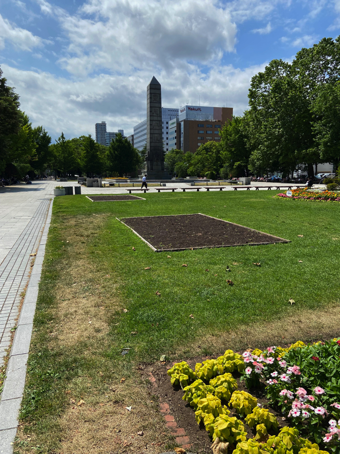封鎖空間を西に一丁ほど歩けば、そこはいつもの大通公園の姿なのだ。しかし、観光客もいないコロナ空間なので、これはこれで異様な光景であるのだなと、無人の芝生を見て思った。普段であれば、この芝生には親子連れが座っていたり、若い学生達が元気に話していたりするのだが。