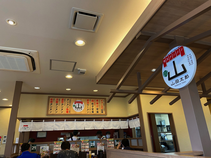 開店1ヶ月も経つから待たされることはないだろうと甘く見ていた。結局、30分ほど待つことになり、店内は非対面式のカウンター席とテーブル席の組み合わせだった。街道筋のロードサイド・ラーメン屋だからカウンターが多めにあるかと思っていたが、テーブル席の方が多い。幸楽苑のオープンキッチンとは異なり、キッチンは奥まったところにあり客席からは見えにくい。壁にぶら下がるメニュー板を見て、あまりメニューは多くないとわかる。よく絞り込んでいるという感じがした。やはり店内にもドカベンくんの姿は見えず、「山」と大きく描かれたブランドロゴが貼ってあるだけだ。ドカベンキャラが店内にいたり、メニュー名にかぶさっていれば楽しかっただろうと思うのは、もはやジジイになったドカベンファンだけだろう。