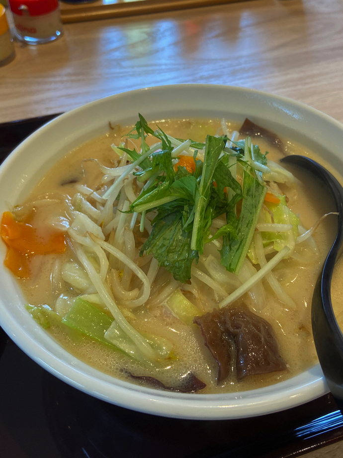 そして一番推しの「濃厚タンメン」を注文した。無料で野菜増しにできるというので、野菜を増量したものがこれなのだが、タンメンという見え方かと言われると、まあ、そんな感じですねえ、というところだ。東京周辺のタンメンの平均的な姿は、塩味スープで細麺、もやしとキャベツや白菜を使った野菜炒めが乗っているというもので、個人的には何やら貧乏くさい(肉っけのない)シンプル中華そばだと思っている。