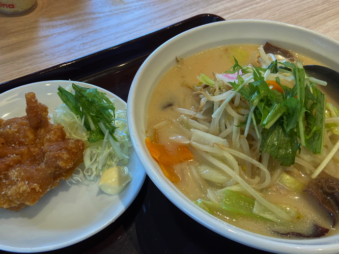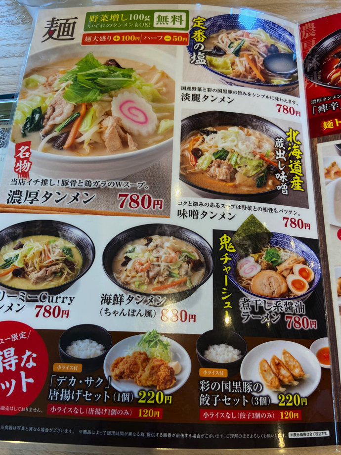 埼玉の野菜をたっぷり使った「埼玉タンメン」というコンセプトはありだと思う。そして、野菜たっぷりということは肉が乏しいので、そこをサイドアイテムで対応するというのも良い作戦だ。当然、麺屋のサイドアイテムとして餃子が思い浮かぶが、そこをちょっと変化球で鳥唐揚げ単品追加売り売りというのが、この店の良い提案だと思った。