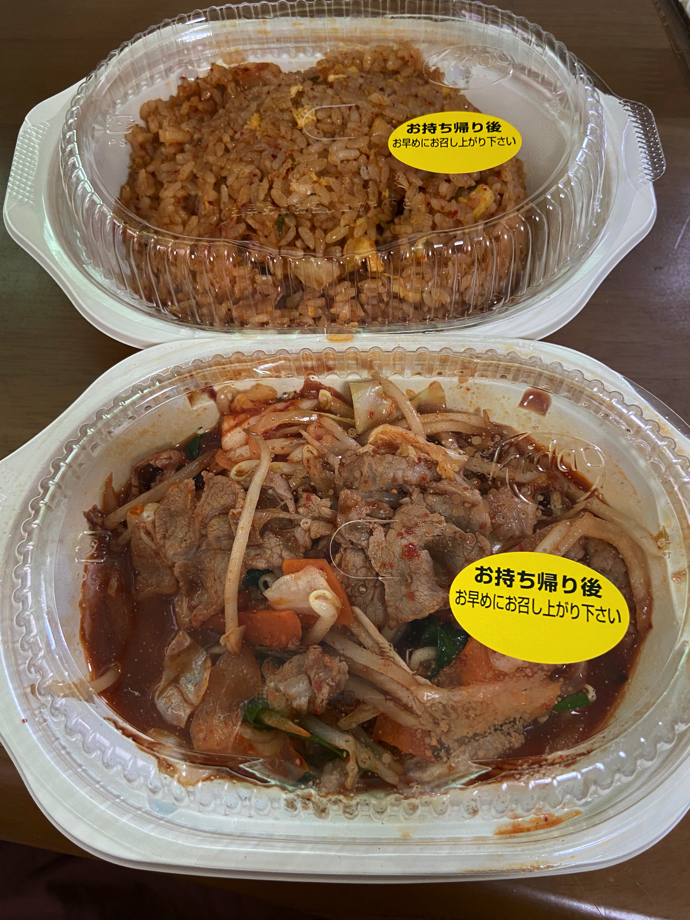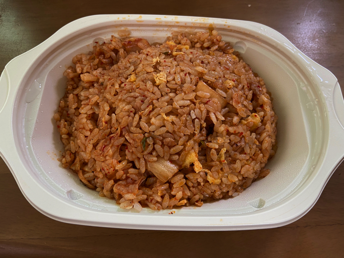 買ってきたものは「バクダン炒め」と「キムチチャーハン」の二品になる。おそらく電子レンジ対応容器だと思うが、お店から歩いて5分で自宅だし、そのまま食べるのでアツアツ状態だからレンジアップも不要だ。