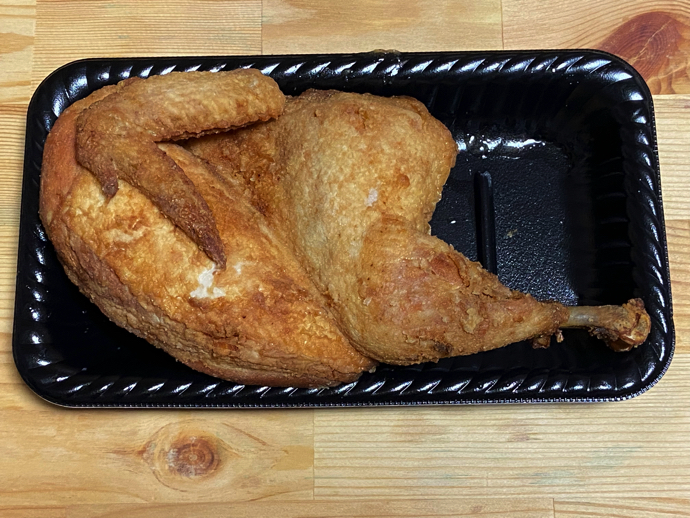 実際に食べてみると、ブロイラーの素揚げなので肉は柔らかい。表面に塩と胡椒その他で味付けはされている。肉の裏面に火通りのための筋を切った跡は見当たらないので、筋切りの前工程はなしでゴロンと半身をそのまま揚げたということらしい。個人的な感想では、普通にうまい、だった。自分の家にある調味料を適当につけて食べればもっと味変が楽しめる、そういう素直な味付けだ。この低価格で辛いとか甘いとかの変化、バリエーションで複数フレーバーを販売する必要はない。だからシンプルな味付けで良いと理解した。低価格店での惣菜は廃棄ロスを考えると、品種の絞り込みは必須条件で、通常の食品スーパーのような多品種展開は不要だと思う。