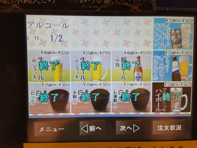 このご時世なので、酒飲料の画面を覗いてみたら、全品終了マーク。ノンアルコールのハイボールテイスト、ノンアルコールビールは販売中。まあ、当たり前の対応なのだが、それでも違和感を感じることも確かだ。