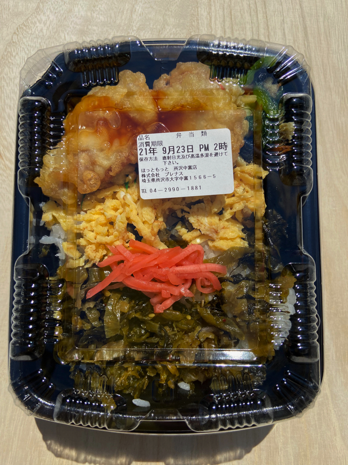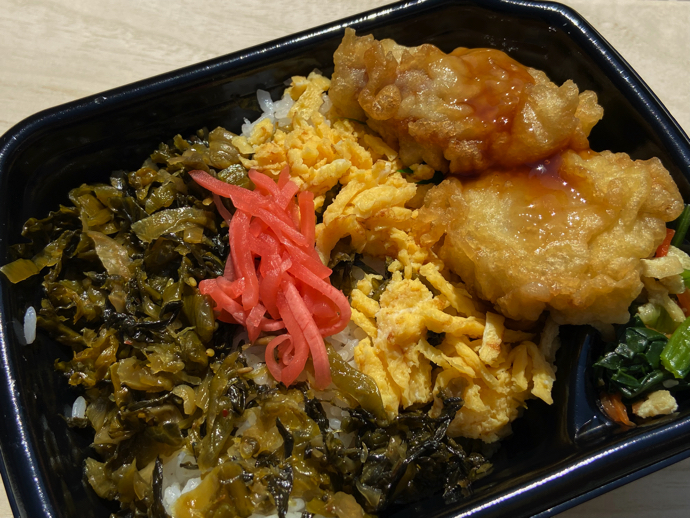 高菜の緑と炒り卵の黄色、そこに紅生姜の赤が乗った3色弁当で、のり弁とは違うゴージャスさみたいなものがある。とり天は柔らかい胸肉なので、甘辛いタレとよくあっている。のり弁のちくわ天は、あのチープさが弁当を引き締めている(笑)と思うが、とり天はほんのりと上品で、そこに微妙な差がある。これが鳥の唐揚げだとワイルドすぎて高菜と喧嘩するだろう。