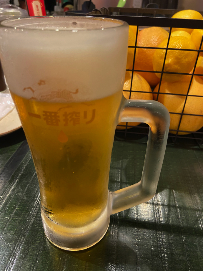 とりあえず横丁の中をぶらついてどんな店があるかを確認した。その後は、迷わず焼き鳥店に突入。最初に「中生」を注文したのだが、飲み屋で酒を頼むのも随分久しぶりだ。