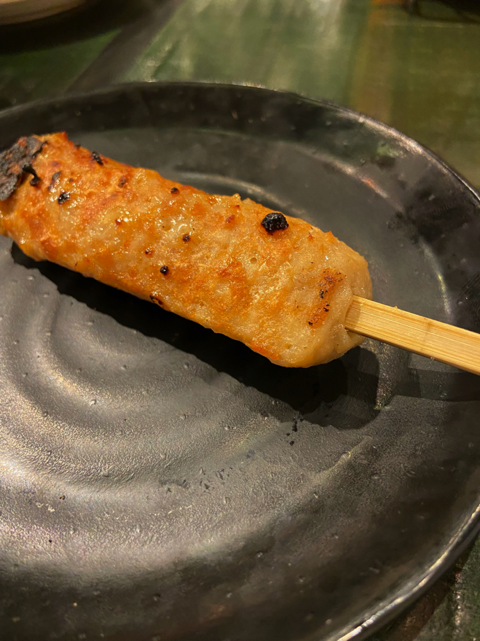 焼き鳥屋のつくねには2大流派があり、この写真のようにバー状のものをつくねと呼ぶ流派と、丸い団子が3個刺さっている「串団子」ならぬ肉団子を捏と呼ぶ派が業界を分けている。焼き鳥屋でこのつくねの形状の話をすると、どちらの流派でもうちが本物と説教された経験があるので、これは業界のタブーであると思っている。