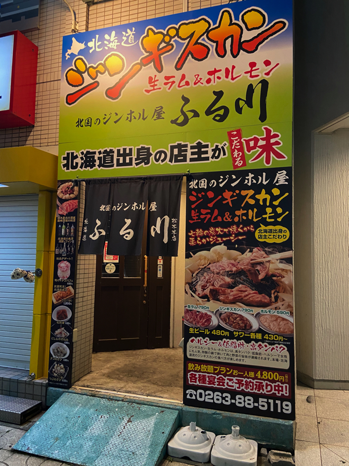 松本駅前で一番突き抜けていたのが、なんとジンギスカン屋で何故か北海道出身者がやっていると訴えている。ほぼ絶叫系だ。看板をよくみると、正確にはジンギスカン屋ではなくジンホル屋だから、松本オンリーな店かもしれない。