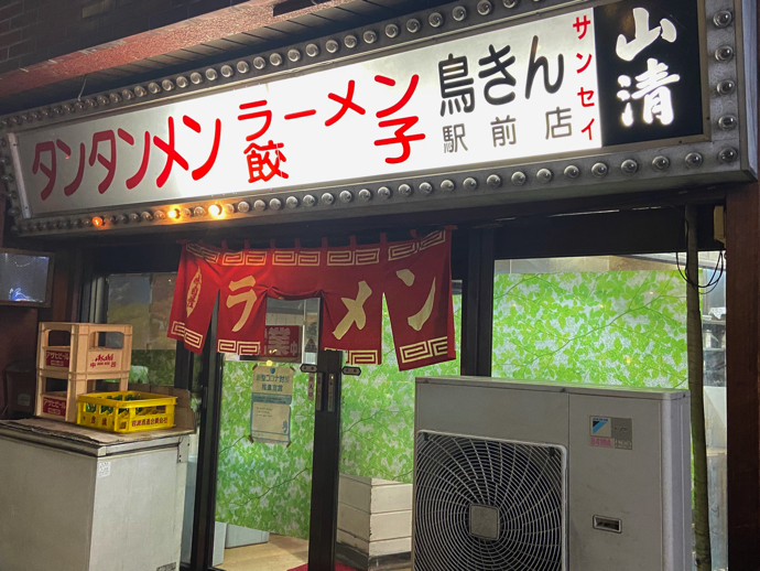 駅前繁華街をちょいと裏側に入ったあたりで出会った「鳥きん」駅前店。ということは他にも支店があるのだろうか。大手町店とか縄手店とかありそうな雰囲気だ。看板に乗っている山清は、松本の北にある酒蔵のようで、日本酒が飲めるラーメン屋ということなんだろう。それもちょっとそそられる。多分昭和の中頃からずっと変わらずに営業しているだろうなと思ってしまう店構え。最近はすっかり見かけなくなったラーメンと書かれた赤い暖簾が麗しい。ここは間違いなく締めの一軒の絶対定番だろう。
