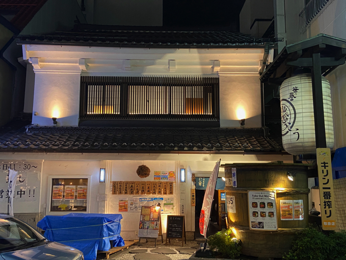 そのイタリアン居酒屋の真向かいにあった、お蔵改造しました的な古風な店構えの居酒屋では、日本酒のラインナップが自慢らしい。確かに白壁のライトアップは夜になるとひときわ目立つ。壁自体が発光看板みたいなものだから、誘引効果抜群だろう。大きな提灯が、この店でも誘蛾灯のように客を引き寄せる。