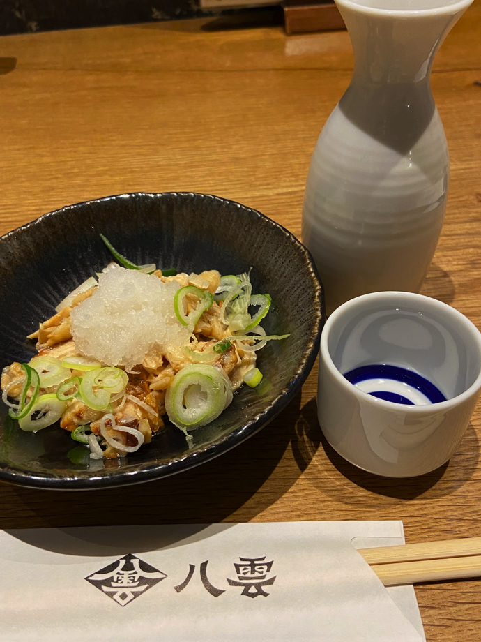 この店で出てくる蕎麦はお江戸のつまみになる蕎麦とは違い、腹一杯になる食事蕎麦だ。だから、一本ずつ摘んでいるといつまで立っても食べ終わらない。お江戸のバーコードのような薄盛り蕎麦はつまみにちょうど良いのだろうけれど。だから、そばが来る前に軽くつまみを注文する。今回は鶏皮のポン酢和え。さっぱりとしたポン酢味に甘めの日本酒がよく合う。銚子が大方開く頃に、蕎麦を頼む。そして、2、3本そばをつまみにしたら、あとは一気に蕎麦を啜る。