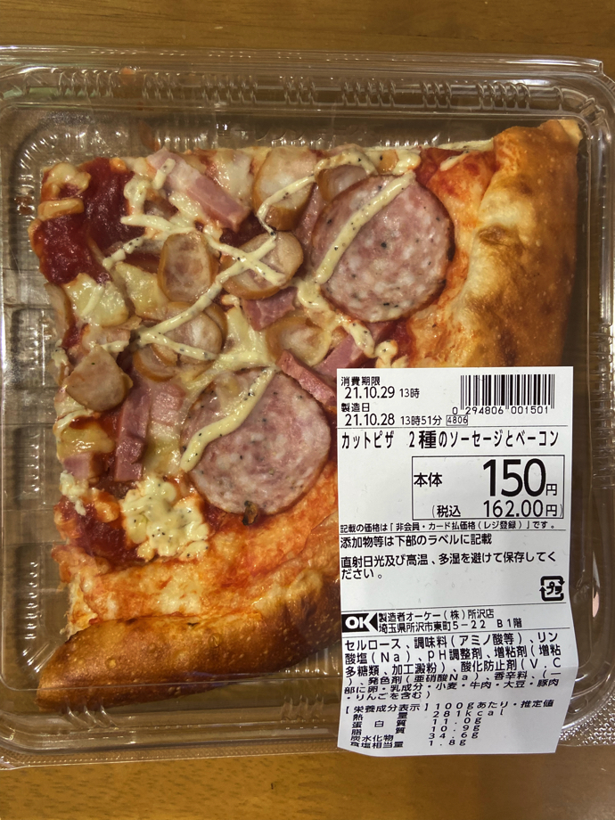 平日にしか売っていないオーケーのカットピザを買い出しに行った。昼飯にしようという魂胆なので二枚買うことにした。だが、二枚買っても300円以下というリーズナブルを超えたハイパーバリュー価格だ。高い方がソーセージとベーコンのピザで、個人的にはこれが一番アメリカンピザっぽい気がしている。