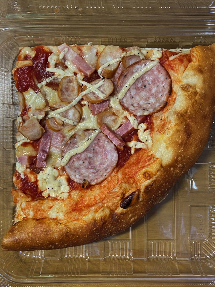 見た目でわかるが、ソーセージを含めてトッピングに焦げた形跡がない。高い温度で一気に焼き上げたというより、低温で火を通した生地の上にぱらっとトッピングを乗せた感じだ。だから石窯焼きピザのパリパリ感は期待してはいけないのだが、そもそもそんなことを最初から考えてもいない。まあ、このピザは平たく言ってしまえばトマトソースとチーズがかかった調理パンだ。生地自体も甘めでふわっとしたリッチ系だ。ご飯として食べるには、ナポリピザのようなリーン系ピザと比べて、こちらの方が出来が良いとも思う。何より肉系トッピングは、食べた時の満足感がたっぷりだ。