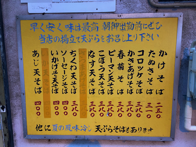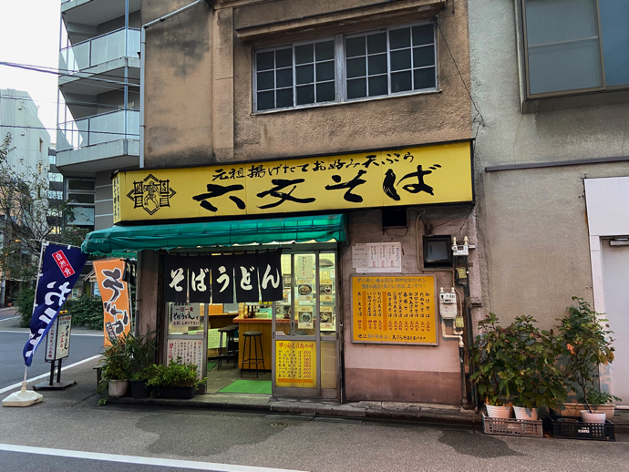 そのすぐ近くに、これは入るのに勇気のかけらも必要ない、オヤジ族の聖地みたいな蕎麦屋がある。ルックス的には間違いなく昭和中期そのまま。朝でも昼でも夜でもふらっと入ってささっと空腹を満たす。立ち食いそばもチェーン店全盛の時代だが、いかにも親父さんが一人でやってますよ的な個人店は貴重だ。懐具合にも優しいから、お試しするのにも敷居が低い。というか敷居がないくらいだ。落語にも出てくるが、屋台の蕎麦の値段は16文だったはずだ。それとくらべて6文という値段はずいぶんお安い。一度店主に店名の由来を聞いてみたいものだ。