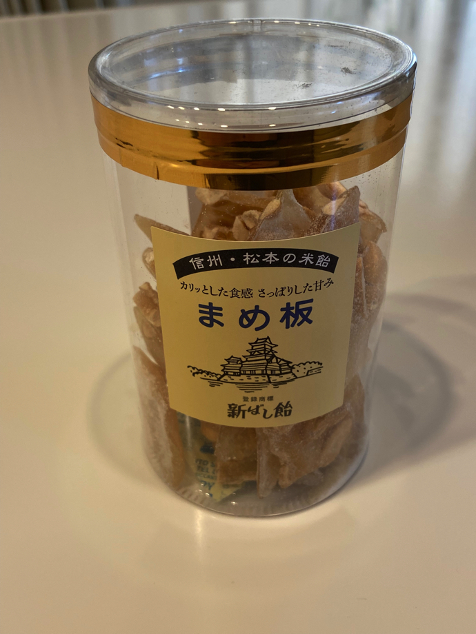 それでも、なんとかネット情報で見つけ出したのは、松本駅のキオスクで何軒かの飴を買えるらしいということ。飴探索の手始めに朝早くに駅に行って、まめ板というものを手に入れた。食べてみるとピーナッツが入った、うっすらと甘いせんべいのような感じのものだった。水飴でもち米を練り上げたもののようだ。カリッとして、さっぱりとした甘味というのはなかなかめずらしいものだった。飴というよりは「飴菓子」という感じがする。夏場は溶けるので注意みたいなことが書いてあった。確かに、これが溶けたら団子になってしまう。夏の土産には向いていないことはわかる。ただ、ちょっとクセになる食感で、今まで知らなかったことは残念だった。